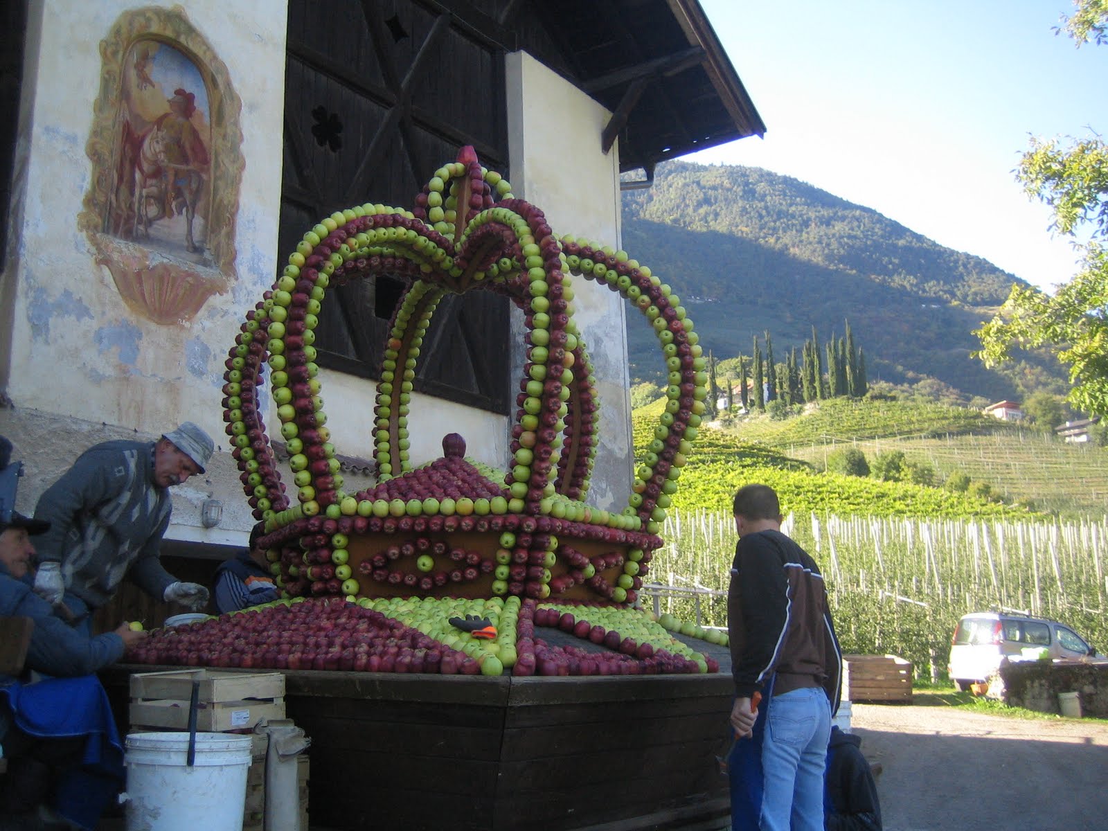 Then we went to Marling, where Mr. and Mrs. Arquin welcomed us with homemade Strudel and coffee. The carriage is already in a advanced building phase, there were various men working on it, hammering the apples with nails on it.