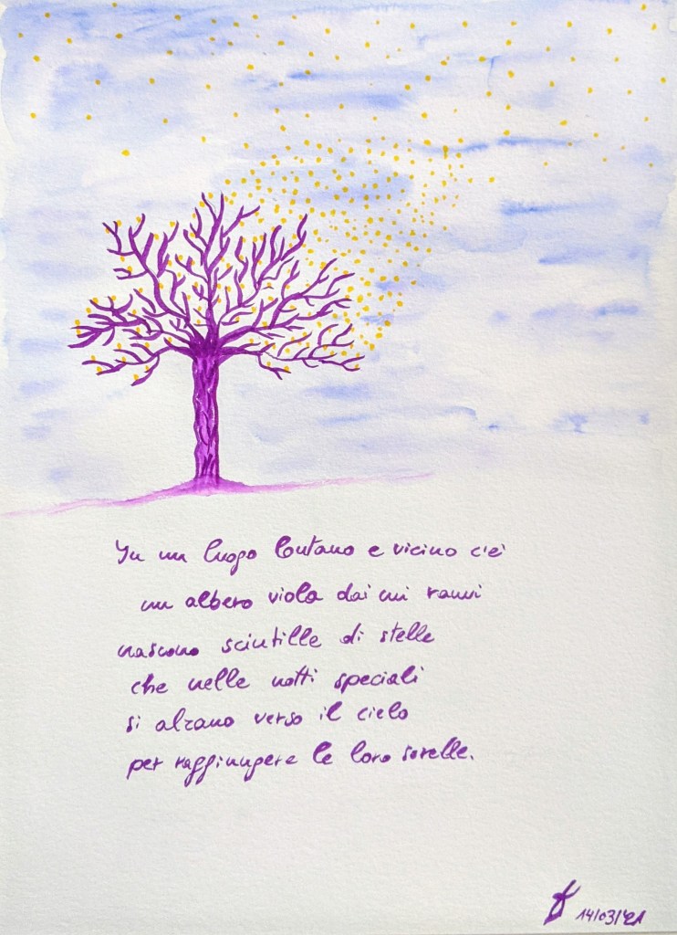 Did it ever happen to you to dream something so beautiful, you had to paint it? During my wonderful meditation winter retreat I dreamt of a purple tree from which little stars would be born and arise to the sky to reach their sisters. The image was so beautiful, I had it in my memory for months – and maybe I’ll keep it forever. I wanted to share it with you 💜