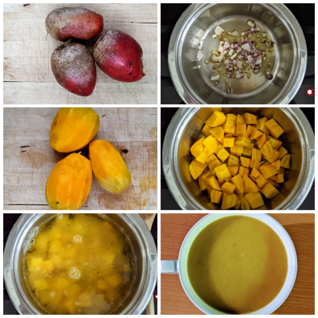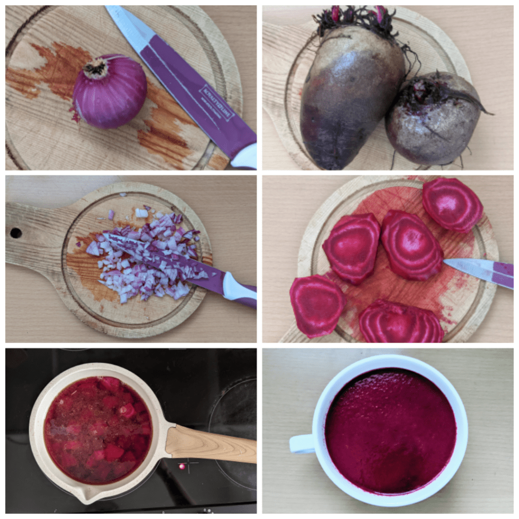 Chop the onion and roast in the olive oil, dice the beetroot and add to the roasted onion, stew them together. Then add the water and let everything simmer for a good half hour. Test with a fork whether the beetroot is cooked through, then add salt and pepper and purée. Serve.