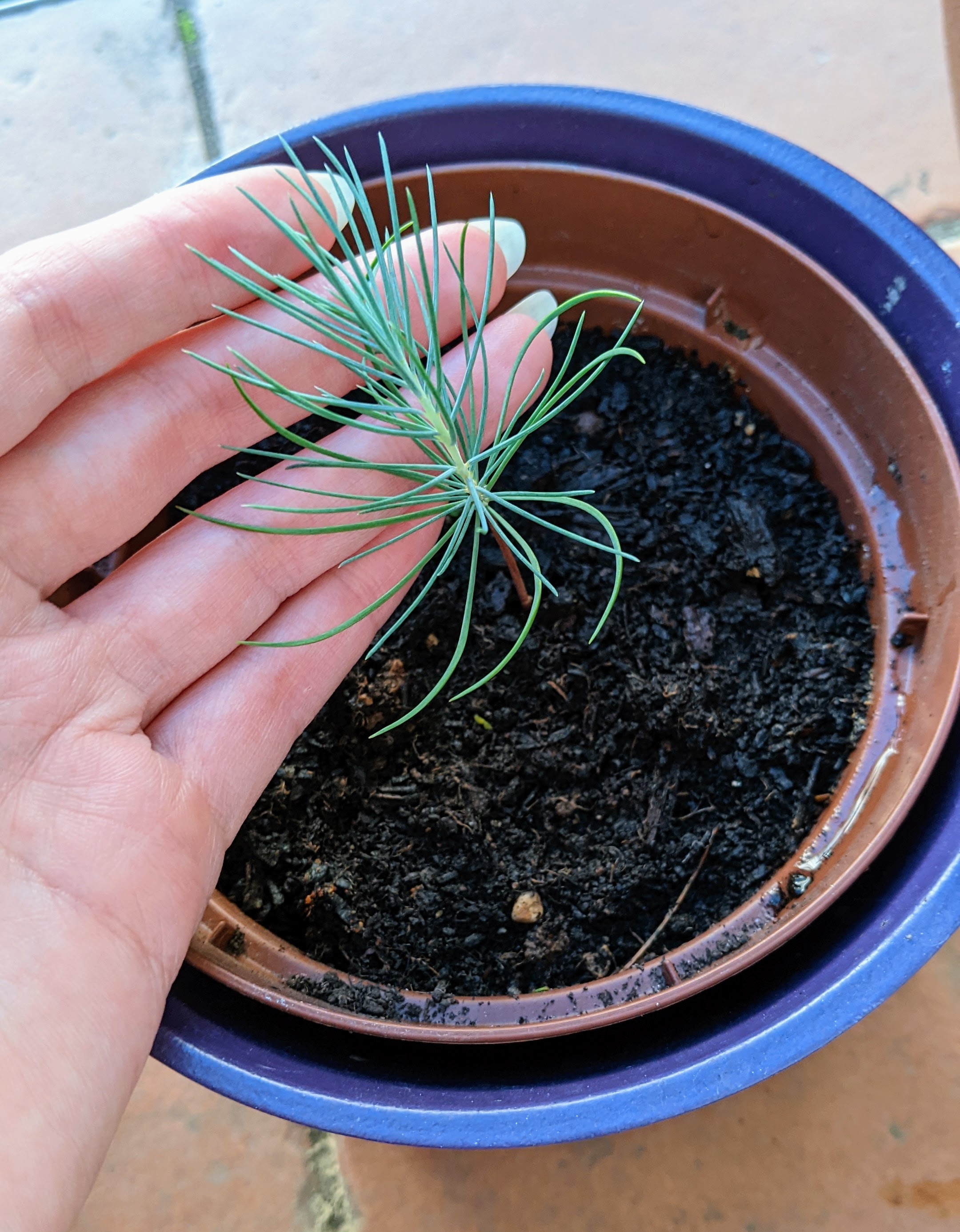 The episode happened a few months ago, in spring. As usual, I had left the pots on the balcony all winter to see what had developed and to put basil and other small plants back in. When I looked closely, I saw a small plant with needles sticking out of it. Looking around, I immediately realised that it was the baby of the pine tree that has been hugging my house for years. I immediately felt a strong affection for this beautiful gift, a little creature that will one day become a tree. I put it in its own pot and watched it grow and its little needles multiply.